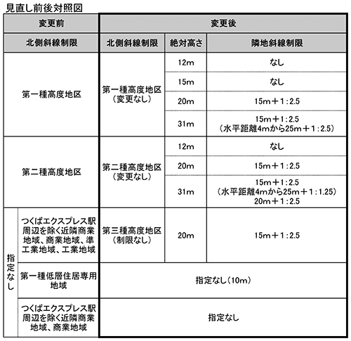 まず、住居系用途地域で低層住宅を中心とした区域では高さ12m、幹線道路沿道の住居系用途地域で、北側に第1種低層住居専用地域を指定している区域では15m、上記以外の幹線道路沿道や中層住宅等を誘導する区域、商業系用途地域では20mという比較的低い絶対高制限とした。なお、土地区画整理区域で集合住宅などの高度利用を誘導する区域では、31mとしている。