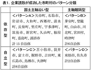 そこで、企業誘致に成功した人口増加自治体を「依存型」と「自立型」、さらに「国土主軸沿い型」と「主軸から離隔型」の2軸で分類すると、表1のような4つのパターンに分類できます。