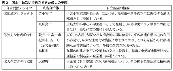 表1のパターンCは、国土主軸沿いですが、依存できる市が近隣にないのに自立できており、何故できたのか、という問題意識で考察を進めます。自治体ごとに考察すると、自立できた最大の要因として、(1)広域プロジェクト、(2)強力な地理的条件、(3)大企業の先行立地、と3つの要因が指摘できます(詳細は表2参照)。