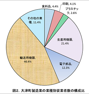 大津町は、熊本県の中北部に位置し、人口は1975年の約18千人を底に増加に転じ、2010年には約31千人にまで急増しています。男性従業者数の産業別構成比をみると、製造業が約36%と圧倒的に多く、製造業が人口増を牽引していることがわかります。さらに製造業における業種別従業者数の構成比をみると、輸送用機器が5割近くを占めていますが、それ以外にも生産用機器をはじめ多様な業種が集積しています。