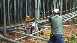 放置竹林対策が全国的に問題となっていますが、現在岸和田丘陵地区において、地元のNPO、鉄工会社、ボイラーメーカー等と連携して、竹の特性を逆手に取った効率的な集材、チップ化、クリンカが発生しない連続燃焼、パウダー利用等に目処を付けながら、バイオマス事業化を進めています。関連して、淡路の洲本市五色町の温浴施設に、竹チップに対応したバイオマスボイラーが年度内には導入される予定です。