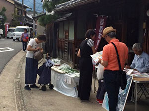 昨年、行われた「のきさき市」では、町家の軒先を借りたお店が出されました。出店にあたっては出店料を設定し、軒先をお借りした町家居住者の方に場所代を支払う仕組みが導入されました。これは将来的に、空き家となっている町家などを活用して、賃貸料などの資金を得ながら、修繕や維持管理にお金を回す仕組みを目指した第一歩として取り組まれたものです。