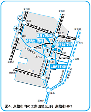 農業とともに東根市産業をリードする製造業の特徴をみるため、業種別従業者数の構成比を図3にみると、農業との関わりが想定される食料を除けば、機械系、電気系の業種が大半であることがわかります。これらの多くは、山形県や東根市が整備した市内の4つの工業団地(図4)に立地していますので、表2のように工業団地の概要(立地時期や立地企業等)を整理してみました。そうすると、最も早い団地では1970年から立地が始まっていますので、東根市の人口増加が1970年頃から始まっていることと符丁があっており、企業立地が人口増加に重要な役割を果たたと思われます。