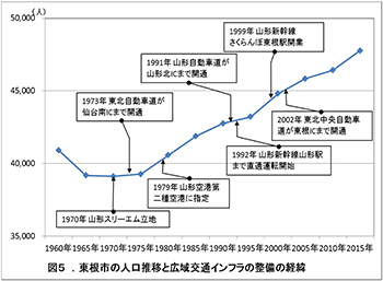 こうした経緯と、最初に確認した東根市の人口動向を図5のように重ねてみると、国土主軸から離れていても、広域交通インフラは次のように重要な役割を果たしてきたと言えそうです。