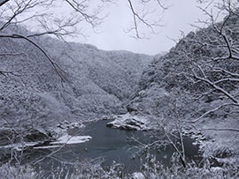 ![]() 浄見原神社脇に広がる雪景色の天皇淵(吉野川) |