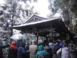 今年はめずらしく雪景色となり、ひっそりと岩壁に佇む舞殿にしんしんと降る雪の中での狩衣姿。冷えきった空気にこだまする歌声や鈴の音に、古代の人々の営みに思いを馳せるとともに、参詣者による玉串奉奠(たまぐしほうてん)が行われたり、村人や参詣者一人ひとりの名前が読み上げられるなど、伝統的でありながらも、地域の人々の手で受け継がれてきた素朴さや和気藹々とした空気感を感じました。