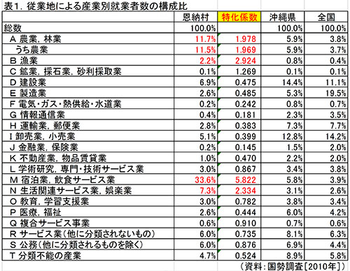 村外から従業者を吸引している産業をみるため、恩納村の就業者数の産業別構成比(従業地ベース)等を整理すると表1のとおりです。恩納村の特化係数(対沖縄県)※1が高いのは、「宿泊業、飲食サービス業」「漁業」「生活関連サービス業、娯楽業」「農業、林業」の順となっており、恩納村の産業がリゾート産業と第1次産業に牽引されていることが読み取れます。