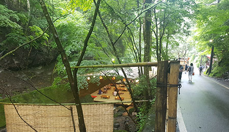 本格的な川床料理に比べて手軽な流しそうめんは、週末には数時間待ちになることもあるとか。それも手軽に避暑を楽しみたい京都人と観光客に待ち望まれているが故のこと。少々の待ち時間も避暑の一環と考え、楽しく過ごすのが良さそうです。(長沢弘樹)