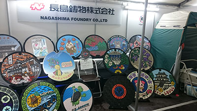当日、ものづくり企業のブース会場を廻ってみると、いわゆるインスタ映えのする展示に出会いました。カラフルにデザインされたマンホールの蓋を展示している鋳物企業の紹介ブースです。出展企業の方にお話をうかがうと、鋳物のまち・川口を発祥の地として、現在も本社があり、工場は県北部とのこと。全国各地のマンホールの蓋を製造し、この会社と中国地方のもう1社で国内シェアの多くを占めているということでした。