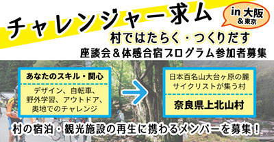 日本百名山大台ヶ原の麓にある奈良県上北山村(人口約530人弱)で、数年前よりサイクリストが集う村づくりのお手伝いをしています(詳細は3ページ参照)。現在、村では、休業中の宿泊施設をサイクリストや村民、大台ヶ原に観光に訪れた方が集い、また宿泊する施設へ再生する取り組みを行っており、ハードの検討ともに、村での運営組織立ち上げも検討しています。そこで、一緒に働いてくれるメンバーを募集することになりました。
