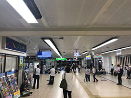 ![]() 夜9時前の高槻駅。漏水した箇所は応急処置されているが、鉄道は運転再開していないため駅に座り込む人も。 |