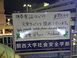 そんな中JR高槻駅では、駅で足止めされている人のために、地元の大学生有志がコンセントと携帯電話の充電器を提供する、「充電ボランティア」を行っていました。大学の発電機を借り、自宅からにコード付きタップ、携帯電話の充電器を自宅から持ち寄ったとのことで、学生はほとんどが下宿生。自らも被災している中、困ったときはお互い様、の精神でしょうか。ボランティアは夜遅くまで続けられ、少し充電してほかの人に譲る、という光景もあったようです。