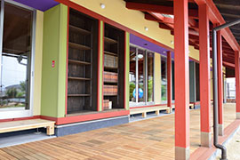 ドマには書架を設けました。ドマを通るこども達や保護者、ここを訪れる近所の人たちが気軽に本を手にとって縁に腰掛けて本を読める。本は誰が置いてくれてもよいし、誰が借りていってもよい。