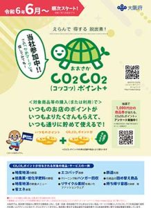 大阪府内にお住いの方やお勤め等されている方は、今年度参加事業者のお店で、図の啓発ちらしにあるような亀のマークを探してみてださい。また「おおさかCO2 CO2ポイント+ホームページ」に参加事業者の店舗や対象商品サービス、ポイントがもらえる期間をまとめていますので、チェックしてみてください。