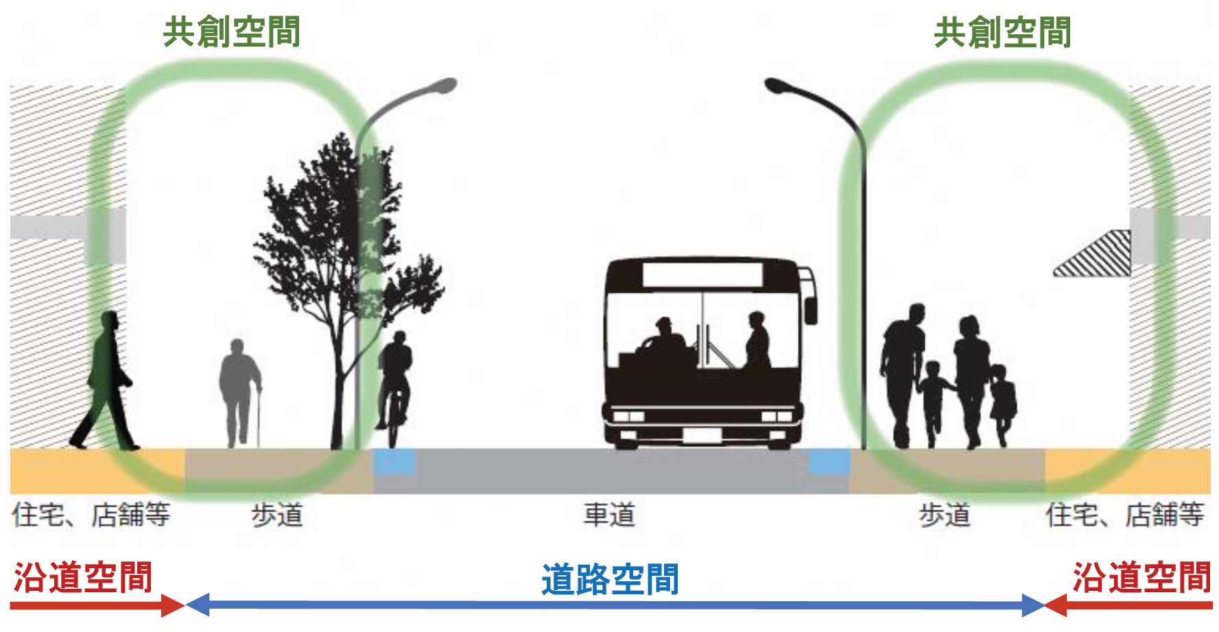ガイドラインでは、道路空間、沿道空間だけでなく、歩道から軒先に至る空間を「共創空間」と定義し、居心地のよいまちなかを形成するために重要な空間と位置付けました。この「共創空間」に、滞在や交流が生まれる利活用を行うことで、人の活動がまちに表れ、景観となる空間づくりを目指しました。