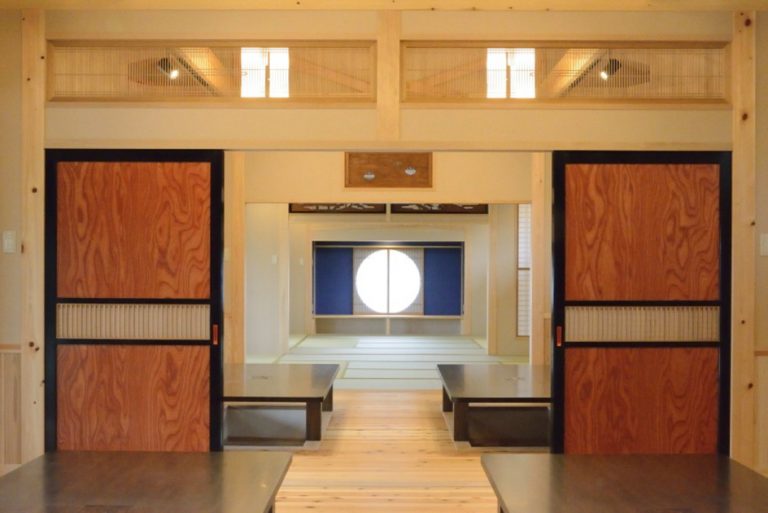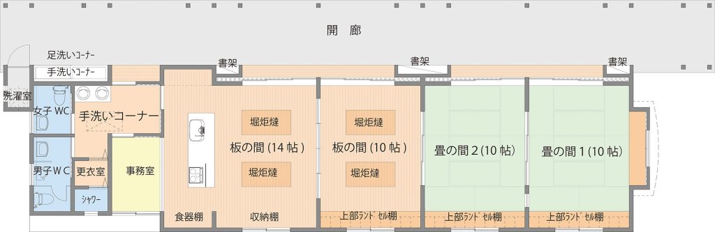 計画案は、南側駐車場から隣接する第二松の実保育園への動線上に半屋外の広いドマ(開廊)のラインを引き、そのドマに沿って4つの続き間(板の間2室、畳の間2室)を配置した極めてシンプルなものとなりました。ドマにそって細い縁を設け、どこからでも部屋に入ることができ、どの部屋からも琵琶湖を観ることができます。