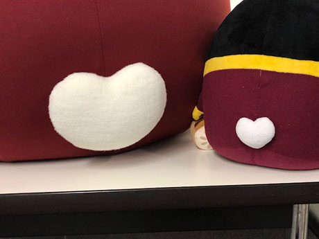 確かに着ぐるみの「動き」は魅力的ですが、活用するには意外と制約があります。その点、特大ぬいぐるみであれば設置したらOK、時間制限もありません。抱きついたり、少しくらいならこづいたりもできます。(これは着ぐるみではなかなかやりにくいことです。)特大松茂係長ぬいぐるみは今年度から本格的な活用となりますが、PRの役割を果たしてくれる期待大です。