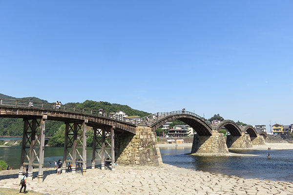そのため、錦見に住む下級武士は、横山に行くために200メートルの川幅のある錦川を渡らなければなりませんでした。当時錦川は度々氾濫し、橋は橋脚ごと流出したことから、三代目当主(藩主)である吉川広嘉は早くから流れない橋の研究を進めていました。ある時、明の帰化僧・独立から西湖の5つの島に架かるアーチ橋の話を聞き、これをヒントに5連橋の錦帯橋を思いつきます。以後何回かの架け替えを経て現在の錦帯橋があります。
