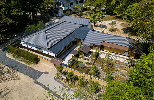 今回、吉香茶室の修理の設計にあたり、現存する形を変えないために屋根裏と床下に耐震リングを設置して耐震性を確保しました。屋根は瓦と銅板を全面的に葺き替えましたが、古い瓦は今回新しく作庭した茶庭に使用しました。茶庭はかなり荒れた状態でしたので、今回の修理で新しく作庭することとなり、蹲や飛び石などはそのまま用い、外露地や内露地を明快にできるよう露地門や中門、外待合などを配置し、全体の動線を含め作庭しました。