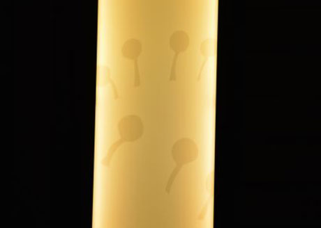田辺らしさの表現については、照明デザイナーの長町志穂さんに協力いただき、柱が面で光る「光柱」としました。表面には田辺に関係する図柄9種類が薄くプリントされており、裏から光が当たると浮きあがります。弁慶や熊楠等に関係する図柄を探すのも楽しいです。光柱の色は年間で特別な日は変わり、また床面の照度は時間で変わります。帰ってくる市民や味光路を訪れるお客さんを出迎える特徴的な照明です。商店街の皆様の決断により、全国の商店街でも類例のない照明が実現しました。ぜひ夕方以降に見に訪れていただければと思います。