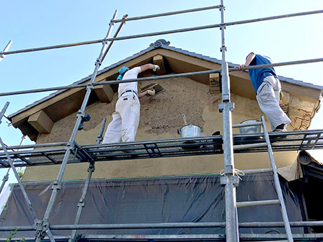 再生前は、経年による傷みが各所に見られました。屋根瓦は劣化やずれがひどく、雨漏りの痕跡も確認できました。壁の左官仕上は剥落し、多くが波鉄板に置き換わっています。構造材の腐朽もありました。古民家再生に度々登場するメンバーは、大工さん、瓦屋さん、左官屋さん、建具屋さんです。今回も、このメンバーを中心に工事を進めます。まずは屋根の修理です。古瓦や葺土を丁寧に撤去し、新しい瓦を葺きます。昔の瓦は小振りなサイズで、軒瓦や袖瓦の垂れや熨斗瓦の厚みも薄くなっています。そこで、64版という一回り小さい瓦を採用し、役物は特別に焼いた「篠山型」瓦を使って仕上げます。続いて壁の修理です。土を何度も塗りつけて修理した厚みのある土蔵の荒壁に、「灰中塗」という、ざらりとした手触りの、ほんのり土色の砂漆喰のような、丹波地域特有の仕上材を塗ります。他に漆喰塗の蔵戸の修理や、腐朽軸組の根継や取換え、構造補強も行い、内部も居室としてリノベーションすることで土蔵の再生は完成です。