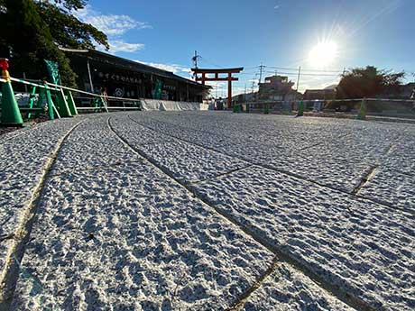 この神社の宮前広場周辺の整備工事と合わせて、神社の西側に流れる賀茂川に架かる御薗橋の架け替え工事や、御薗橋西詰から神社までの道路拡幅整備、宮前の交差点をロータリー交差点にするなど、隣接する公共空間等の整備が並行して行われていました。これらの御薗橋から宮前の参道空間が広がったことで、御薗橋から見る宮前広場と新設「大鳥居」と既存の「一の鳥居」、その背後に見える神山(こうやま)が象徴的な眺望を生み出しており、新たな神社の顔として見えてきます。