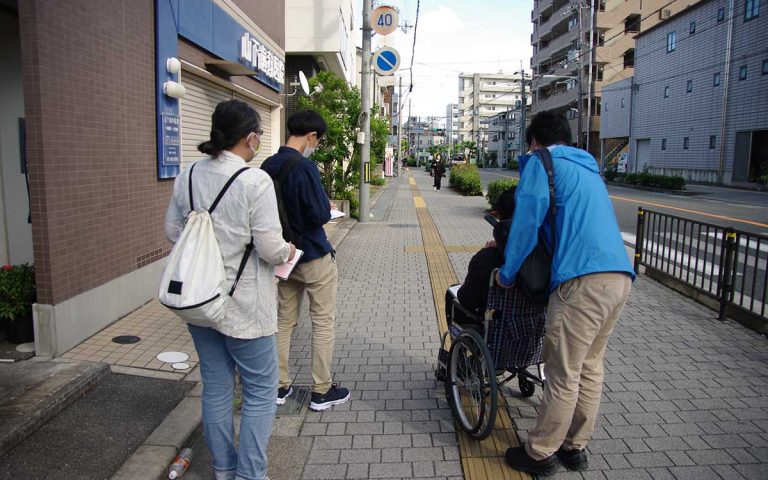 その後、10月17日のワークショップでは、まず参加者のみなさんとまちあるきを行いました。まちあるきでは、自身の視点に加えて、ツールを活用しながら、高齢者や車いす利用者、子どもを連れた親、自転車利用者など様々な利用者の視点を持って、通りの魅力や課題、印象などを見つけました。