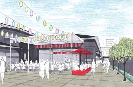 施設は、約千平方メートルの敷地に、「黒塀」のある花街の雰囲気をモチーフにしたデザインを施し、八王子踊りや八王子太鼓などの地域の文化的催しや花街の芸妓さんの踊りなどを楽しめる大広間、出店を志す人のためのチャレンジショップ、中庭にはイベントや飲食が楽しめるにぎわい広場を整備します。花街や地域の文化を楽しめることで地域全体の集客を図り、チャレンジショップで力をつけた店舗は近隣地域での出店につなげていきます。