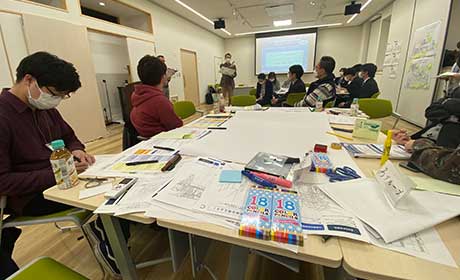 ワークショップでは、地元の住民や商業者の方々のほか、市内外の3大学の学生さんにも参加してもらい、実際にまちあるきをしながらまちの良い点を探してみたり、まちの将来像を描いたイメージスケッチに塗り絵をして手を動かしながら、より具体的な将来像を考えました。また、イメージスケッチの実現のために何ができるのかを行政職員の方々に考えてもらうワークショップも行い、様々な視点から今後目指したい未来の景観の姿を検討しました。