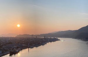 シンポジウム前日には遠方からお越しの先生方に松江市を知っていただくため、現地視察を企画しました。しかしここで問題となったのが、松江市がこの時かつてない賑わいを見せていたことです。市内・周辺のホテルは満室、タクシー会社も軒並み予約が取れずという非常事態でした。そんな中、市内の観光バスの社長さん直々の運転により、アルパックご一行のバスツアーがスタートしました。市街地のフリンジ部分の開発動向を見ながらバスは美保関まで向かいます。美保関には美保神社のほか、青石畳の通りに沿って旅館やお店が連なります。周辺には木造3階建ての趣のある建物やリノベーションされた建物が見られます(あとで伊藤氏にお聞きしたのですが、リノベーションした建物は公開されており誰でも入れるのですが、一見そう見えないところが奥ゆかしい山陰らしさであるとのことです)。美保関を堪能した我々は、境港から見える夕日を眺めながら帰路につき、翌日のシンポジウムに向けて体力を養うため美味しい松江ご飯をいただくのでした。