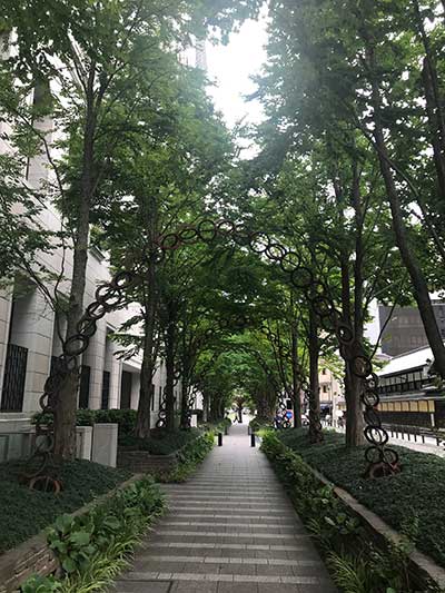 大阪事務所がある淀屋橋駅周辺には多くのパブリックアートが設置されています。事務所の隣のビルにも作品があり、ひとつは青木野枝「空の粒子/パッセージ」という作品で、サイズや幅の異なる鉄版のリングを組み合わせて形成されています。鉄の集合体なのですが、周りの樹木や植物と融合して有機的な空間がひろがっており、私の中でほっとできる場所です。